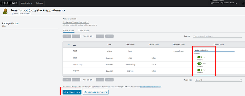 Enter your values; we will type `kuber.gohost.kz` in the host field, move the sliders from `false` to `true`, and click “DEPLOY”.